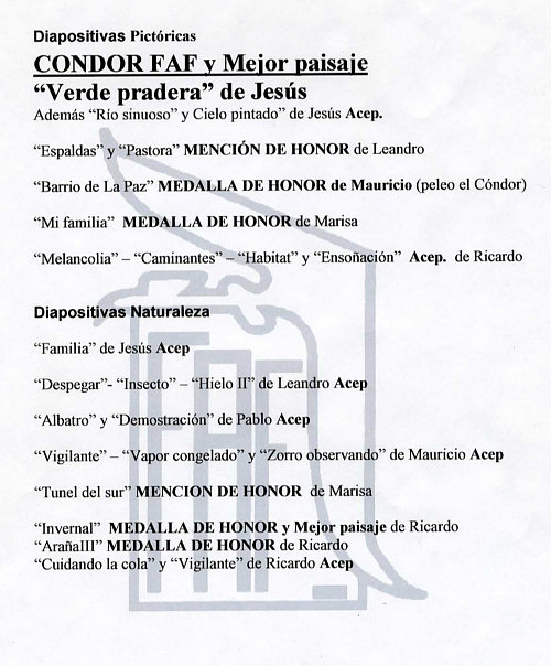 Primer Premio “CONDOR FAF “A la obra “Verde Pradera” en la sección Diapositiva Pictórica.